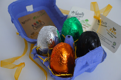 The sweetest, happiest and not to forget- healthiest- Chocolate Egg idea I've been able to find all Easter! You just gotta love the gorgeous recycled egg box, that the set of four cuties come in, all individually wrapped in coloured foil to identify each flavour, set on shredded 'hay' and wrapped in a lovely ribbon and card.