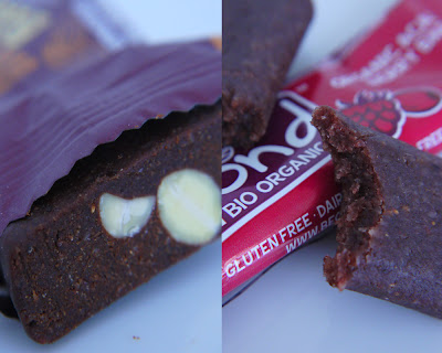 Beond Acai berry bar ingredients: raw dates, raw almonds, raw raspberry powder, raw acai powder, raspberry flavour. Beond Raw choc bar ingredients: raw dates, raw almonds, raw cacao powder, raw raisins, raw agave nectar.