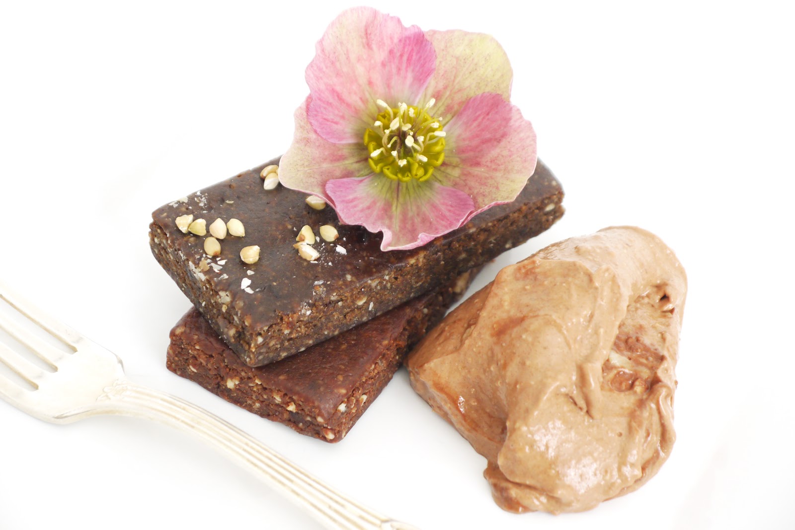 Carob Hazelnut brownie ingredients: coconut palm nectar, cashews, dates, buckwheat, hazelnuts, carob powder, vanilla powder, himalayan salt