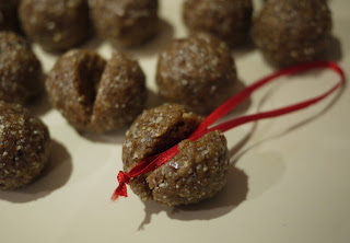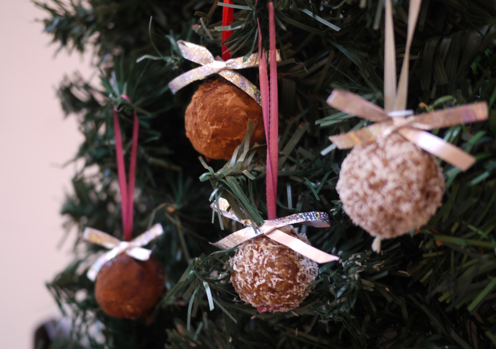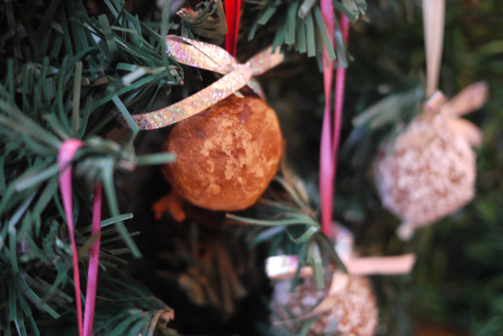 - Cut each Caramel ball half way (careful not to slice right through), insert the tied ribbon as in picture, so the knot is hanging at the bottom and just touching the ball (the knot will help stop the sliding of the ball off the ribbon while it hangs on the tree)