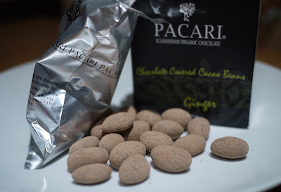 That is Cacao beans coated in... Cacao! Does it get any better than that? I think so, because it is spiced with dried ginger. Wow! I can't believe I haven't been introduced to such heaven before. I tried to figure out if it is a Raw product, as none of the ingredients suggest otherwise and I have a feeling it may just be- you can usually tell by the taste- when the chocolate doesn't have that bitter roasted tang and in this case you can even tell by the colour of the powder coat- it is light, just like raw cacao, not dark like roasted.