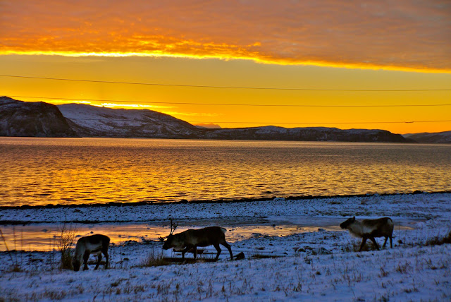 In one day, we drove around six different islands, had a gigantic moose run in front of our car, saw wild reindeer casually walking along shore lines, witnessed a stunner of an hour long sunrise, then a brief 15 minutes of striking orange sun, followed my the most extraordinary 3 hour long sunset; we got through multiple snow storms, rain and hail, drove on roads of snow and ice, over bridges, through underground tunnels and on a ferry across different islands. It's hard to believe that we managed to squeeze it all into a mare 4 hours of natural daylight, that the far Northern part of the globe receives daily at this time of year.