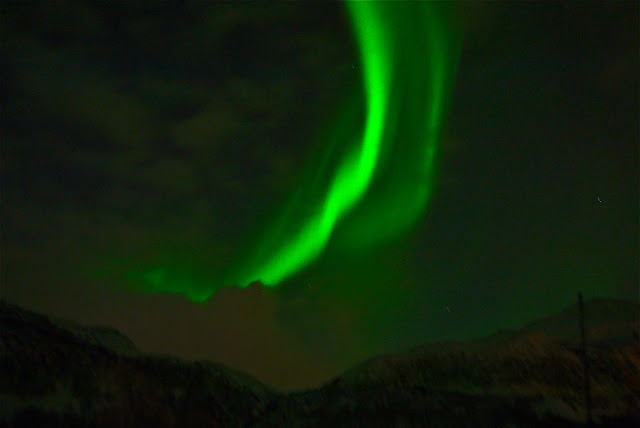 Now it's pitch black with just a few stars peeking out from the swiftly moving clouds. We are headed for a remote tip of one island called Sommaroy, which earlier that day was suggested to us for excellent sighting of the Aurora Borealis.