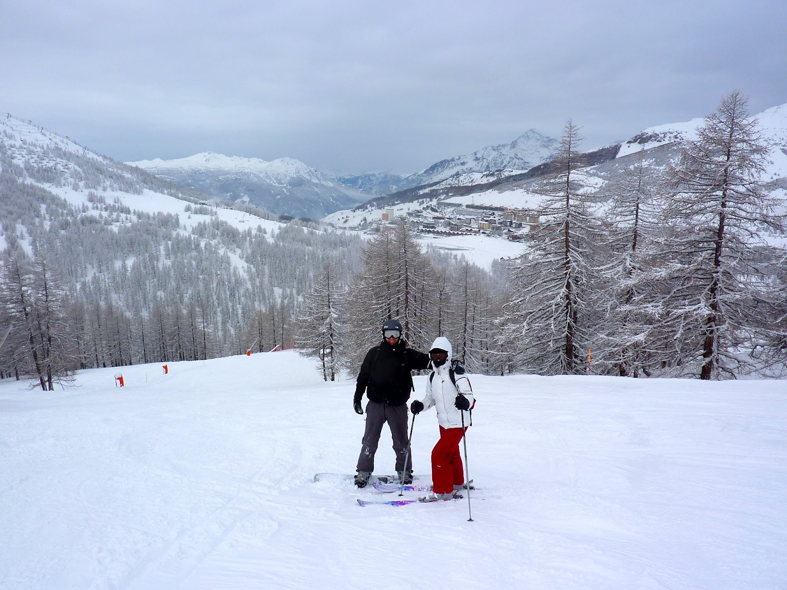 Elliot on snowboard, me skiing |