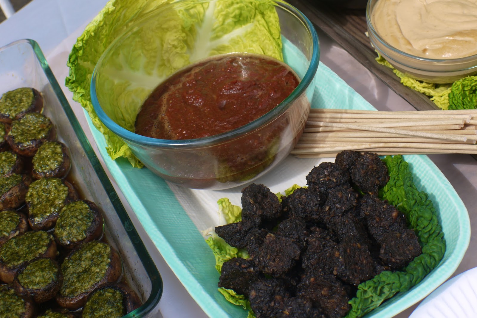 These mushroom nut balls and tomato ketchup are a delicious idea, possibly best kept for a more intimate dinner occasion. They take quite a long time to first soak and marinate, then process, then roll into balls and then dehydrate, but disappear in record time. Serve them with toothpicks to pin and dip or over courgette noodles if you are having them as a main meal. |