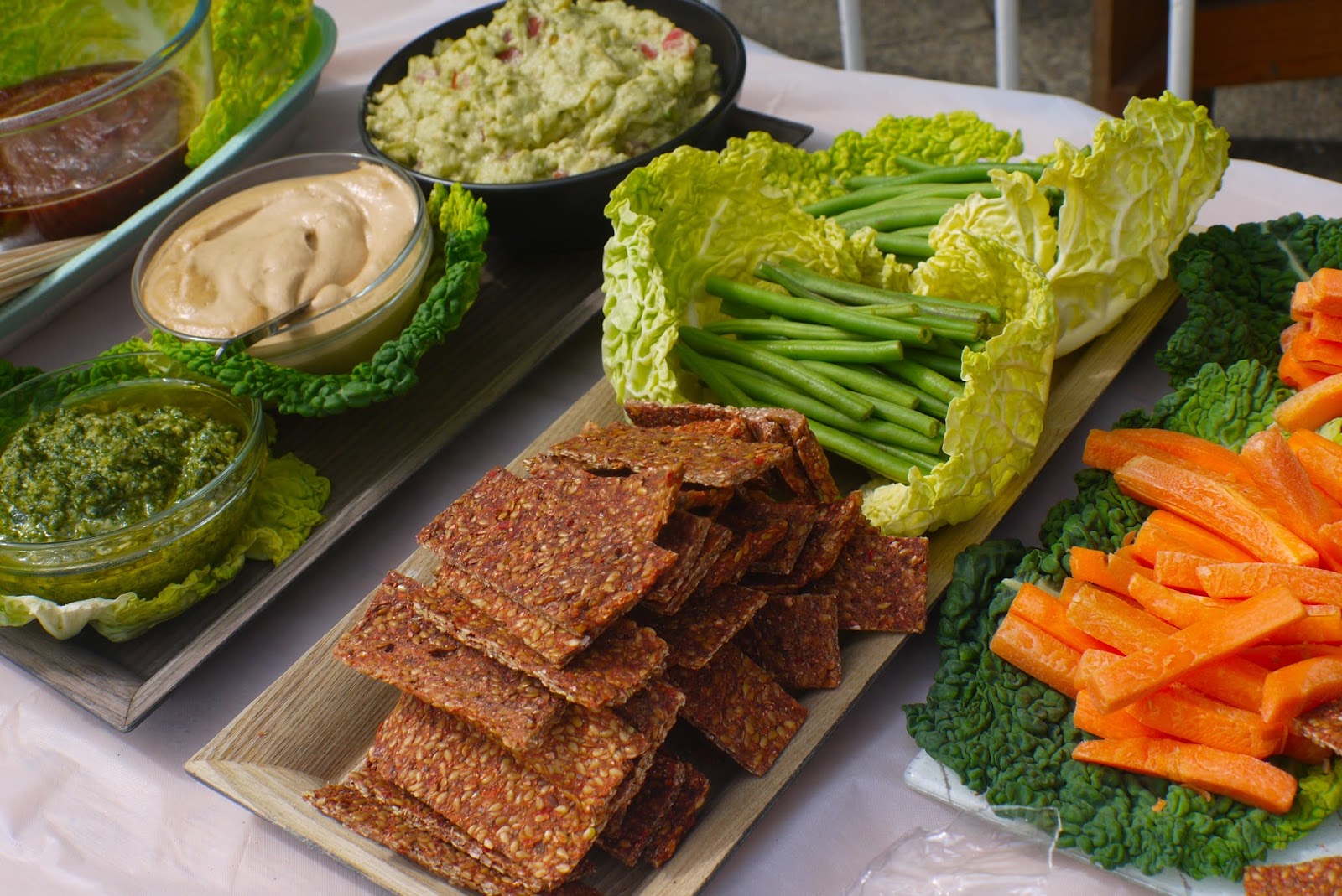 Dips and Dippers. ALWAYS have Dips & Dippers. For simple dippers- carrots, runner beans and celery sticks will do the trick if your dips are tasty enough, but it's always good to add some flaxseed crackers to the mix. For the Dips- I made extra Pesto while doing the stuffed mushrooms, extra Creamy Cheesy Sauce while making the pizza sauce and Guacamole. |