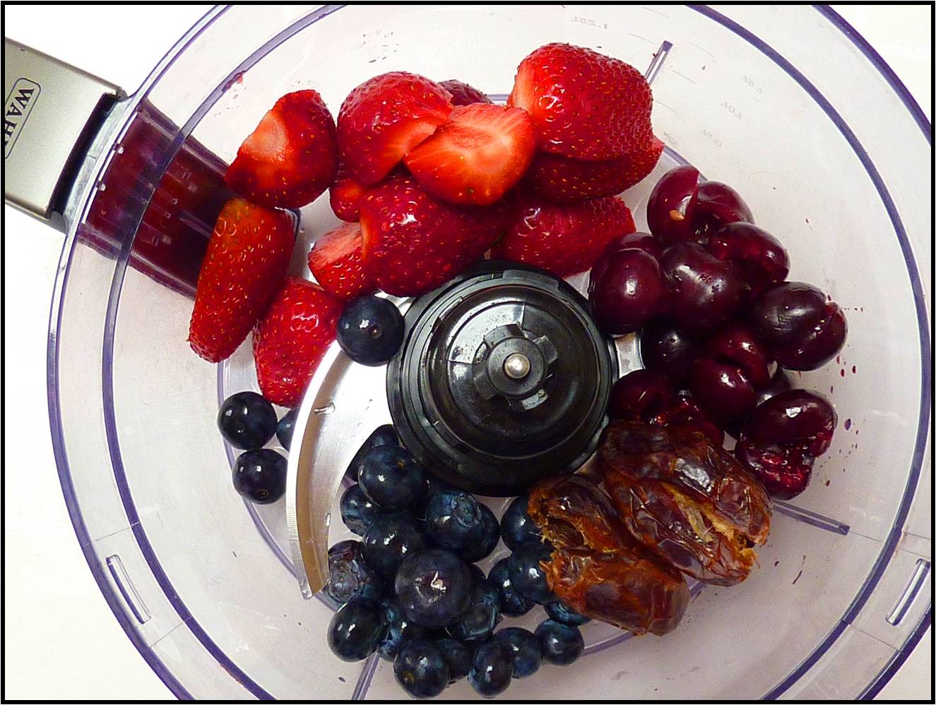 For the sweet cracker: process the strawberries, cherries, blueberries and dates in a food processer with an S blade