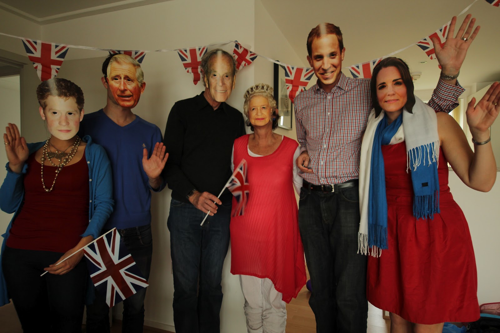 Elliot's parents were visiting us from New Zealand, so we had our very own Royal Party. From left to right: Harry- that'll be moi; Prince Charles- Elliot; Duke of Edinburgh- Richard (dad); The Queen- Adele (mum); William- Matt; Kate- Jen.