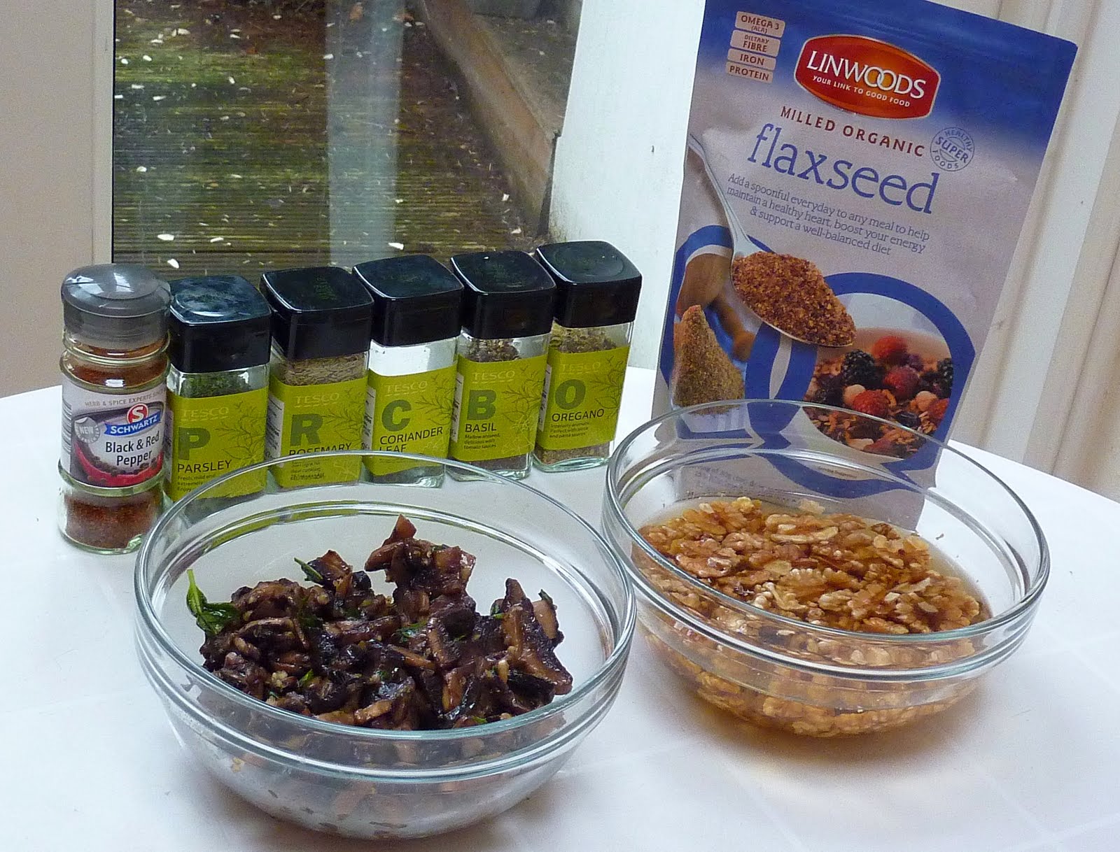 -Rince out the water from soaked walnuts, place them with the mushrooms into a food processer with an S Blade, pulse so they are chopped fine and mixed in, but still slightly chunky
