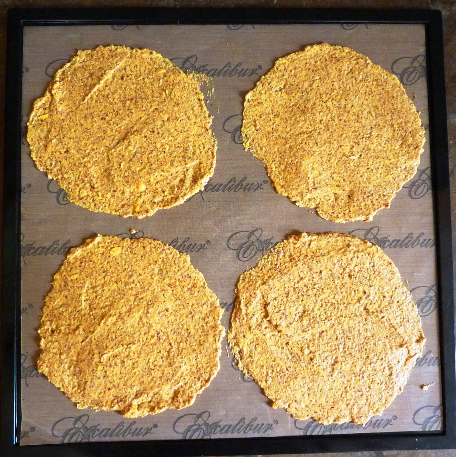 -Spread four equal round bases onto each dehydrator teflex sheet