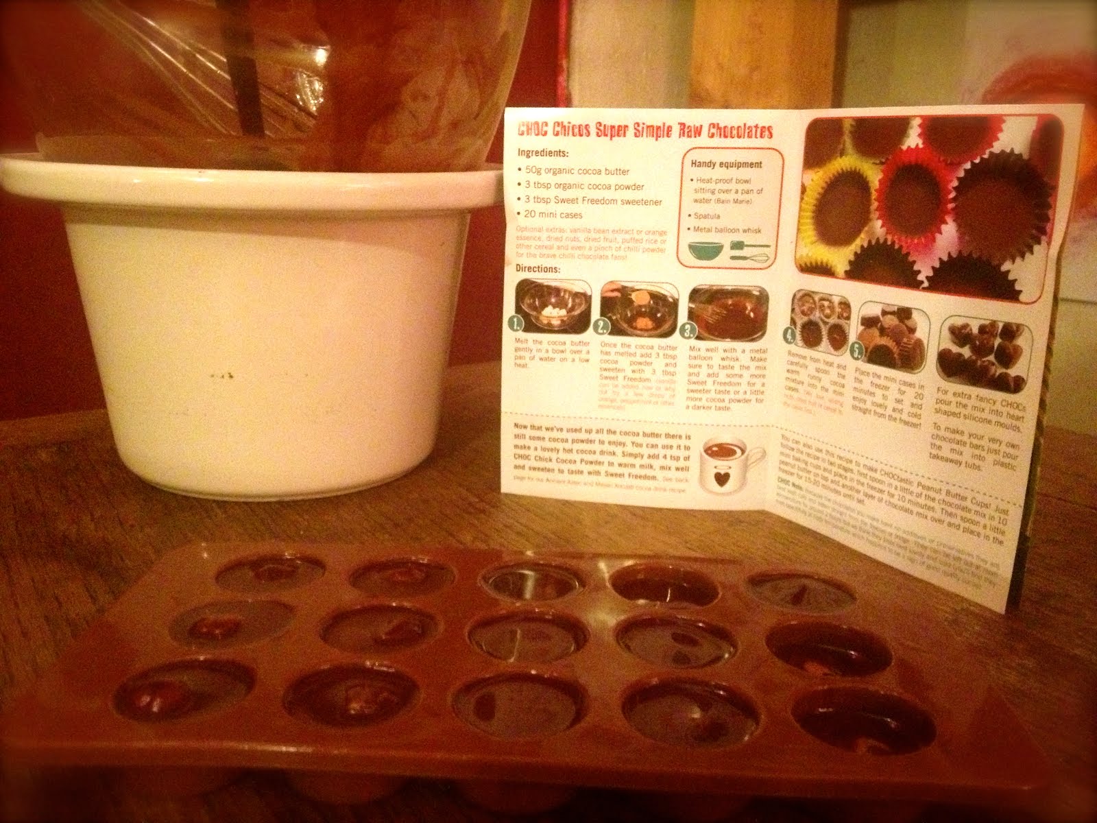 I don’t have any little ones running around me here in my very urban home in East London, but this box was so cute and contained such a delightful kit to make quick, easy and healthy chocolate I couldn’t resist. So I had a fun Sunday afternoon chocolate making workshop knowing that I was the only one to lick the spoon! It really couldn’t be more easy to make raw chocolate at home. The packets are all easily labeled, perfectly measured (something I have a challenge with normally figuring out how much solid cacao butter turns into the melted variety I need), and the whole thing is designed to be quick, fun and low level mess. The instructions are super easy, and everything I needed was provided including little paper cups to pop the chocolates in. I decided to use my chocolate mould, and also added some vanilla powder and hazelnuts.
