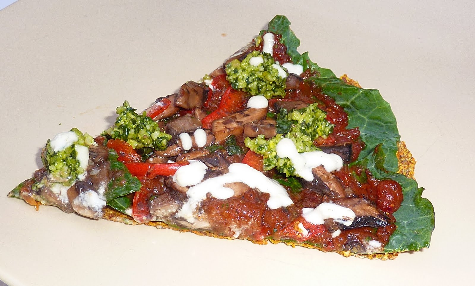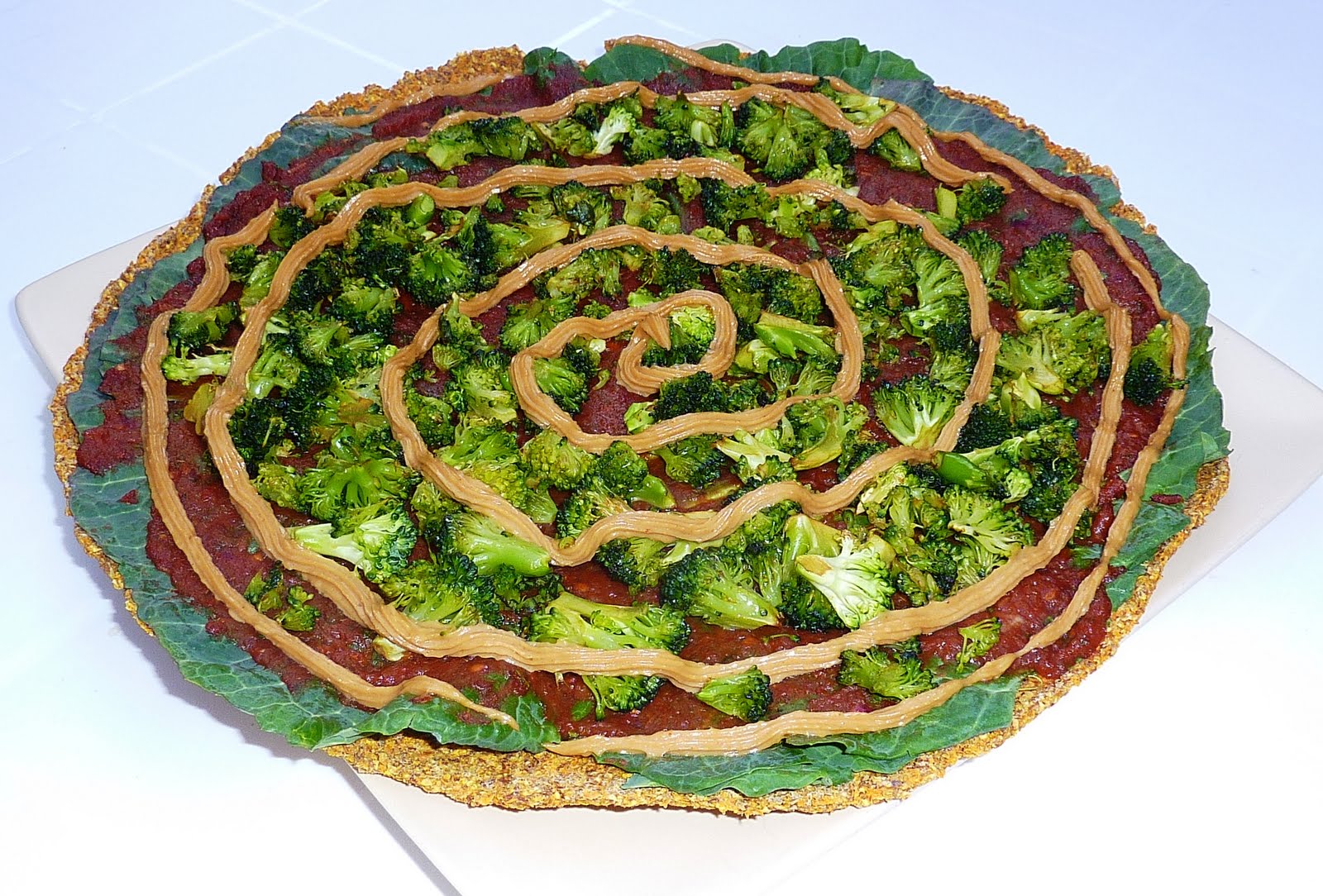 3. Arrange the broccoli onto the pizza base (from previous post) and dehydrate for 2 hours at 41 degrees C. You may find it useful to pour the Tangy Tahini sauce and cut into pizza slices half way through the dehydration process, so that you can serve straight out of the dehydrator while pizza is still warm.